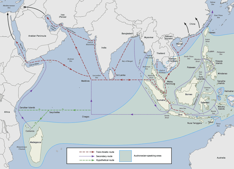 Die maritime Seidenstraße verband Südostasien, Ostasien, den indischen Subkontinent, die arabische Halbinsel, Ostafrika und Europa miteinander. Sie begann im 2. Jahrhundert v. Chr. und erlebte ihre Blütezeit bis zum 15. Jahrhundert n. Chr. Die maritime Seidenstraße wurde hauptsächlich von austronesischen Seefahrern in Südostasien eingerichtet und betrieben.